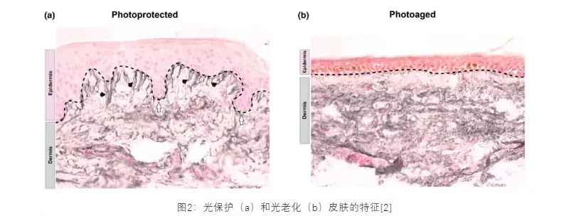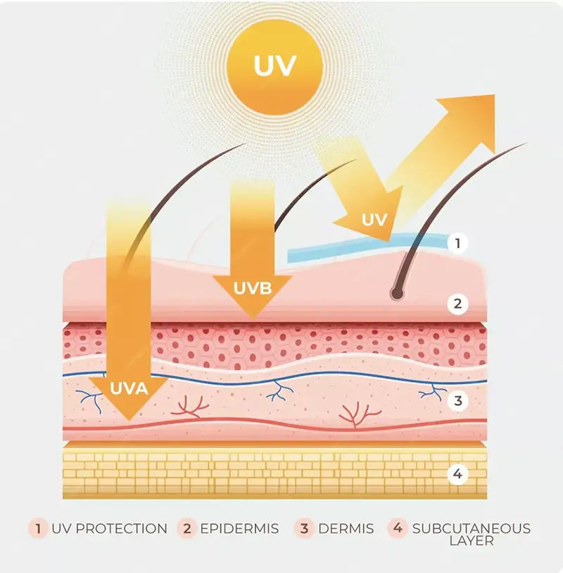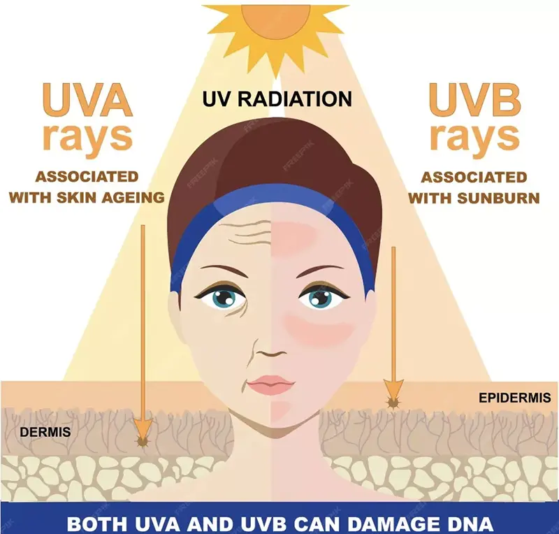 UVA आणि UVB दोन्ही त्वचेचे नुकसान करू शकतात, परंतु त्यांचे परिणाम मुख्यतः त्यांच्या प्रवेशाच्या खोलीमुळे भिन्न आहेत. स्पष्टपणे अधिक समृद्ध UVA त्वचेच्या आत खोलवर प्रवेश करू शकतो आणि ते फोटोजिंगशी अधिक थेट संबंधित आहे, कारण ते ROS तयार करतील आणि कोलेजन आणि इलास्टिन कमी करतील, ज्यामुळे सुरकुत्या पडतील, त्वचेची लवचिकता कमी होईल आणि अकाली वृद्धत्वाची इतर चिन्हे होतील. याउलट, UVB प्रामुख्याने एपिडर्मिसवर परिणाम करते, ज्यामुळे अल्पावधीत सनबर्न (सोलर एरिथेमा) आणि मेलेनिनचे उत्पादन होते, तर दीर्घकाळापर्यंत प्रदर्शनामुळे हायपरकेराटोसिस होऊ शकते आणि त्वचेच्या घातक ट्यूमरचा धोका लक्षणीय वाढतो.