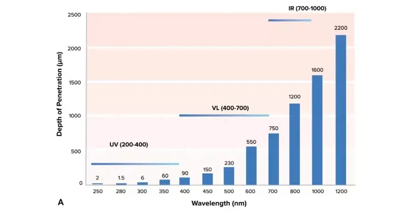 वरील आकृतीत दाखवल्याप्रमाणे, दृश्यमान प्रकाशाचा त्वचेवर खूप प्रभाव पडतो, कारण या पट्टीचा त्वचेत खोलवर प्रवेश होतो. लाल दिवा एपिडर्मिस आणि डर्मिसमध्ये प्रवेश करू शकतो आणि चरबीच्या थरापर्यंत पोहोचू शकतो, जो तरंगलांबी आणि प्रवेश खोली आणि तरंगलांबी आणि ऊर्जा यांच्यातील व्यस्त संबंध दर्शवतो, तर निळ्या प्रकाशात लाल प्रकाशापेक्षा जास्त ऊर्जा आणि कमी प्रवेश खोली असते.